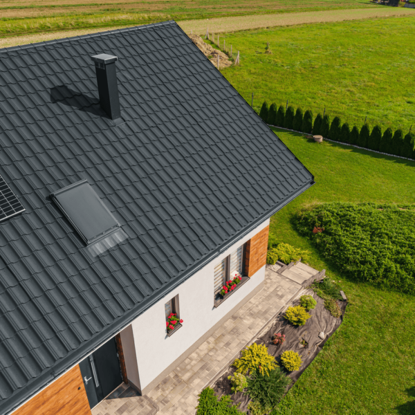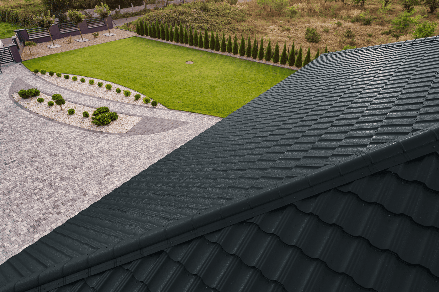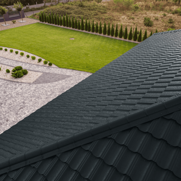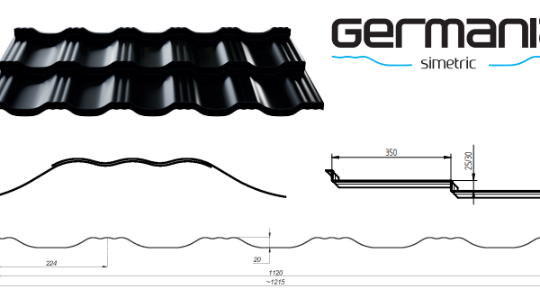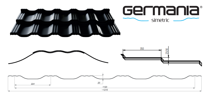 A GERMANIA SIMETRIC cserepeslemez 0,45 - 0,60 mm vastagságú horganyzott acéllemezből profilírozott cserép, fényes vagy matt festékbevonattal gyártjuk.