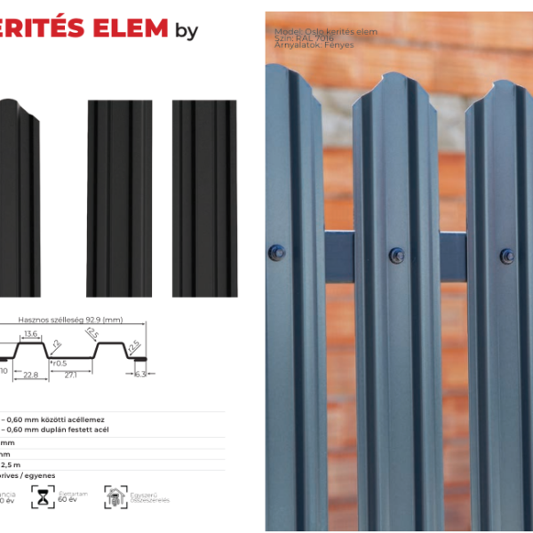 Teljes körűen gondozás mentes tüzihorganyzott és festett íves acél kerítéslécek.