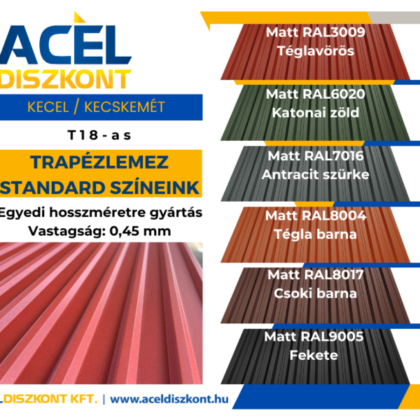 Saját gyártású T18-as trapézlemezünket az építmény követelményeinek függvényében 0,4 – 0,6 mm-es névleges vastagságban gyártjuk, a modulok standard hossza 0,2 – 12 m.
