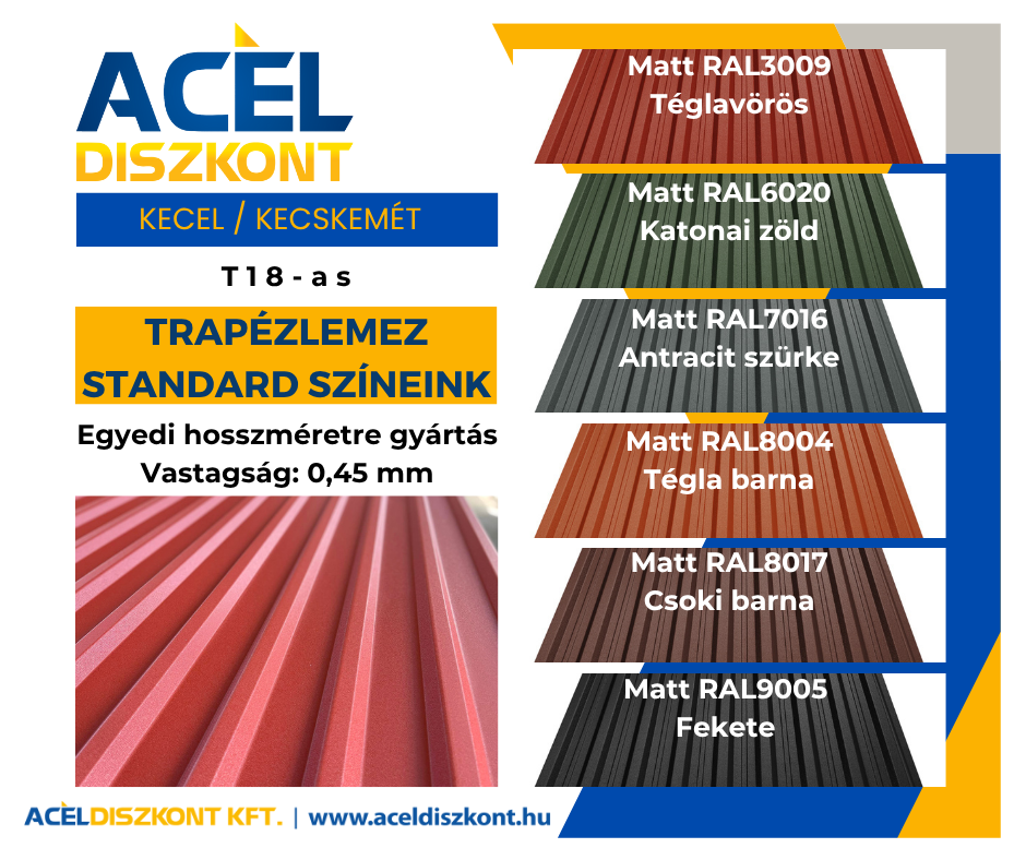 Saját gyártású T18-as trapézlemezünket az építmény követelményeinek függvényében 0,4 – 0,6 mm-es névleges vastagságban gyártjuk, a modulok standard hossza 0,2 – 12 m.