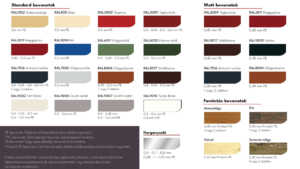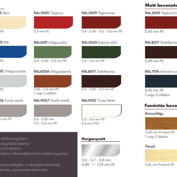 Elérhető matt színek listája 0,5 mm-es vastagságban: