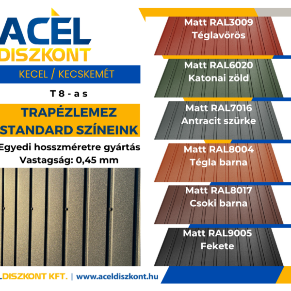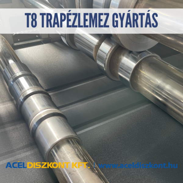 A T8 trapézlemez mindkét oldalán horganyzott és poliészter védőbevonattal ellátott acéllemezből készül. Felhasználási területe kizárólag oldal-burkolás, álmennyezet és kerítés. A lambériához nagyon hasonló a kialakítása. Famintás lemezből élethű kerítés és lambéria készül belőle. Gyártási jellemzők: Saját gyártású T8-as trapézlemezünket az építmény követelményeinek függvényében 0,4 – 0,6 mm-es névleges vastagságban gyártjuk, a modulok standard hossza 0,200 – 5 m.
