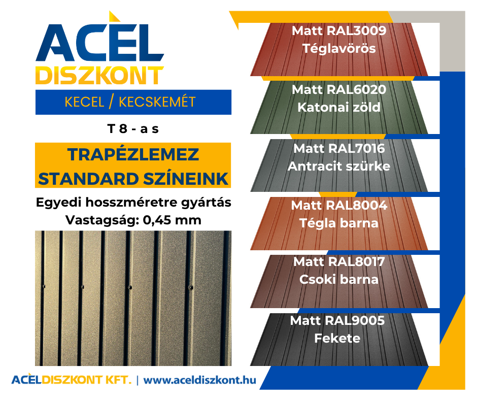 T-8-as trapézlemezünket Keceli telephelyünkön gyártjuk egyedi megrendelések szerint, minden szükséges kiegészítővel egy helyen.