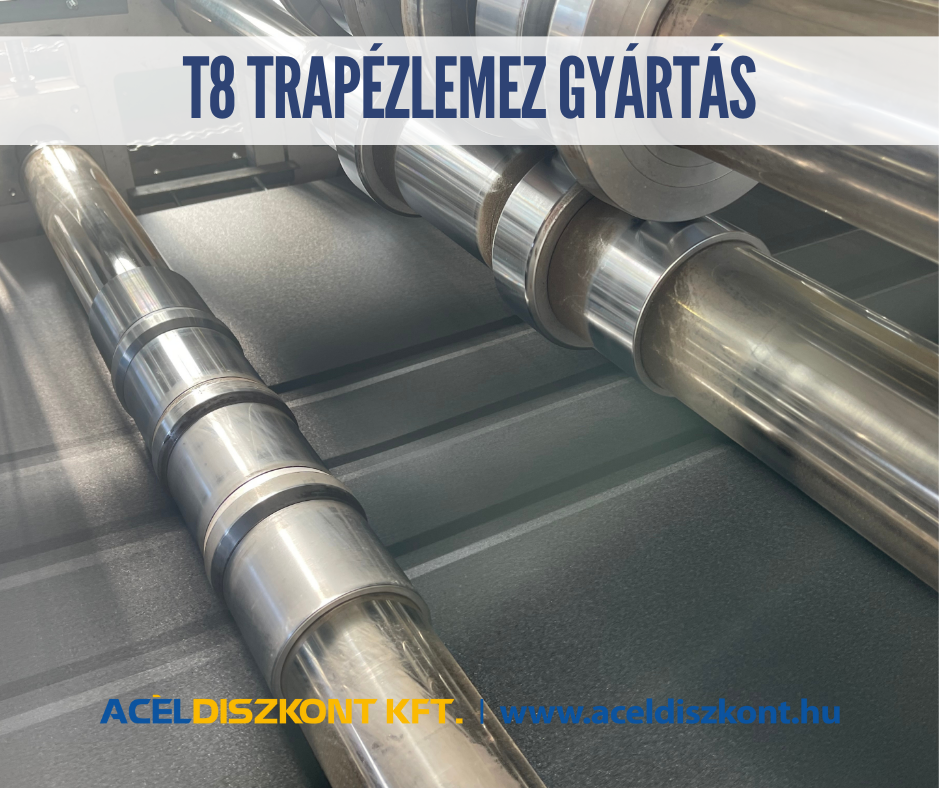 Saját gyártású T8-as trapézlemezünket az építmény követelményeinek függvényében 0,4 – 0,6 mm-es névleges vastagságban gyártjuk, a modulok standard hossza 0,2 – 5 m.