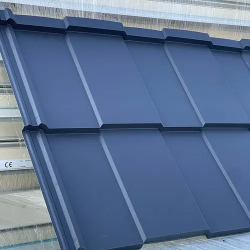 Modern, geometrikus mintázatú fém tetőcserép. Kiemelkedő fedőszélesség (1160 mm), antikondenzációs filc opcióval. Ideális új építésű házakhoz és felújításhoz.