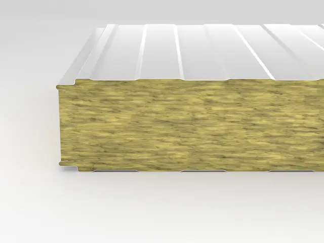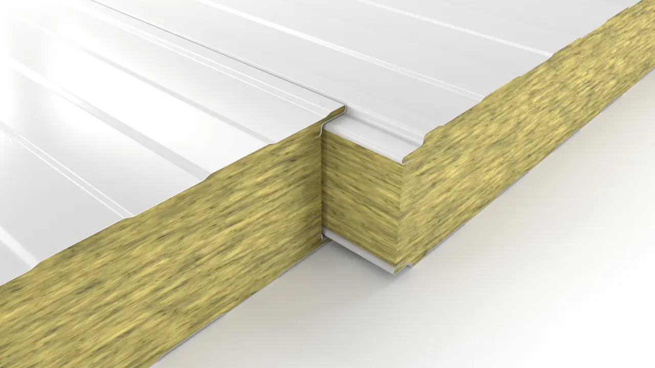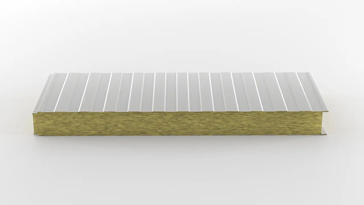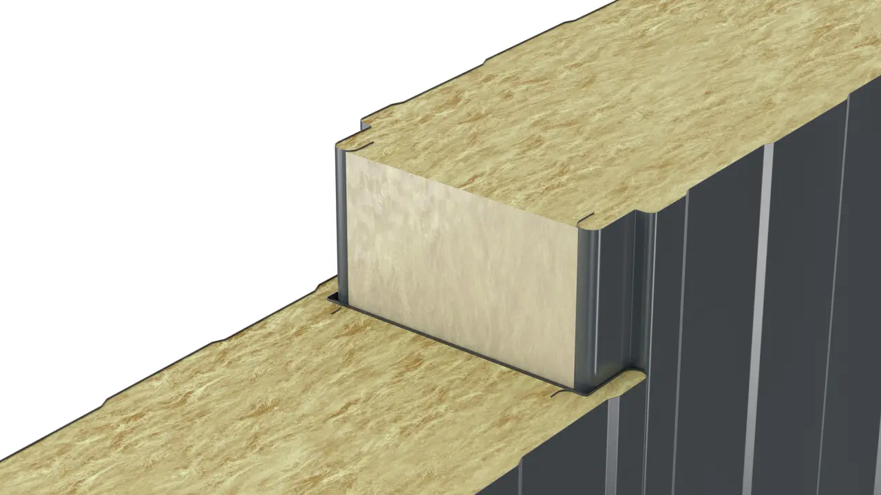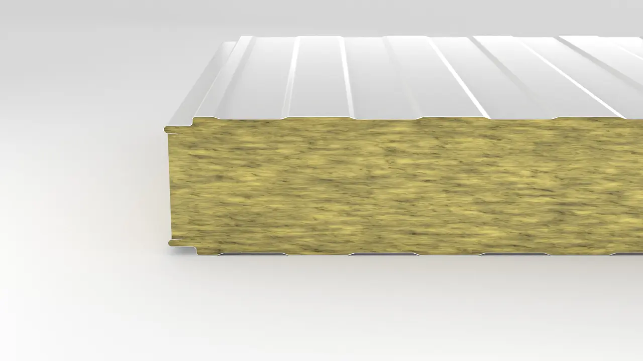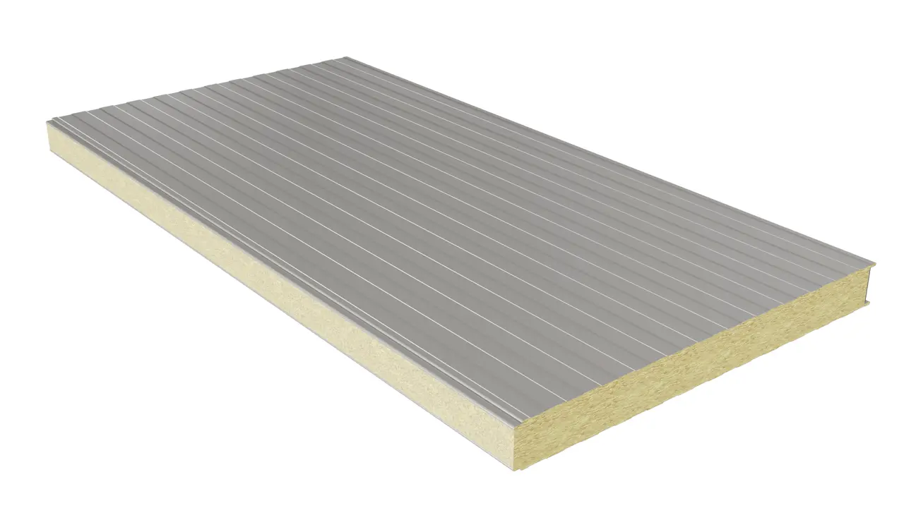 Kiemelt tűzvédelmű (A2-s1,d0) homlokzati panel kőzetgyapot töltettel. Kiváló hangszigetelés, rejtett vagy látszó rögzítéssel ipari épületekhez.