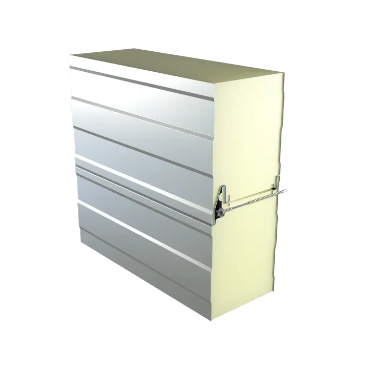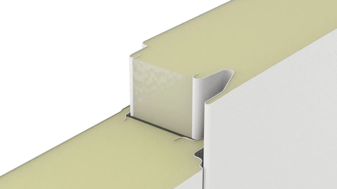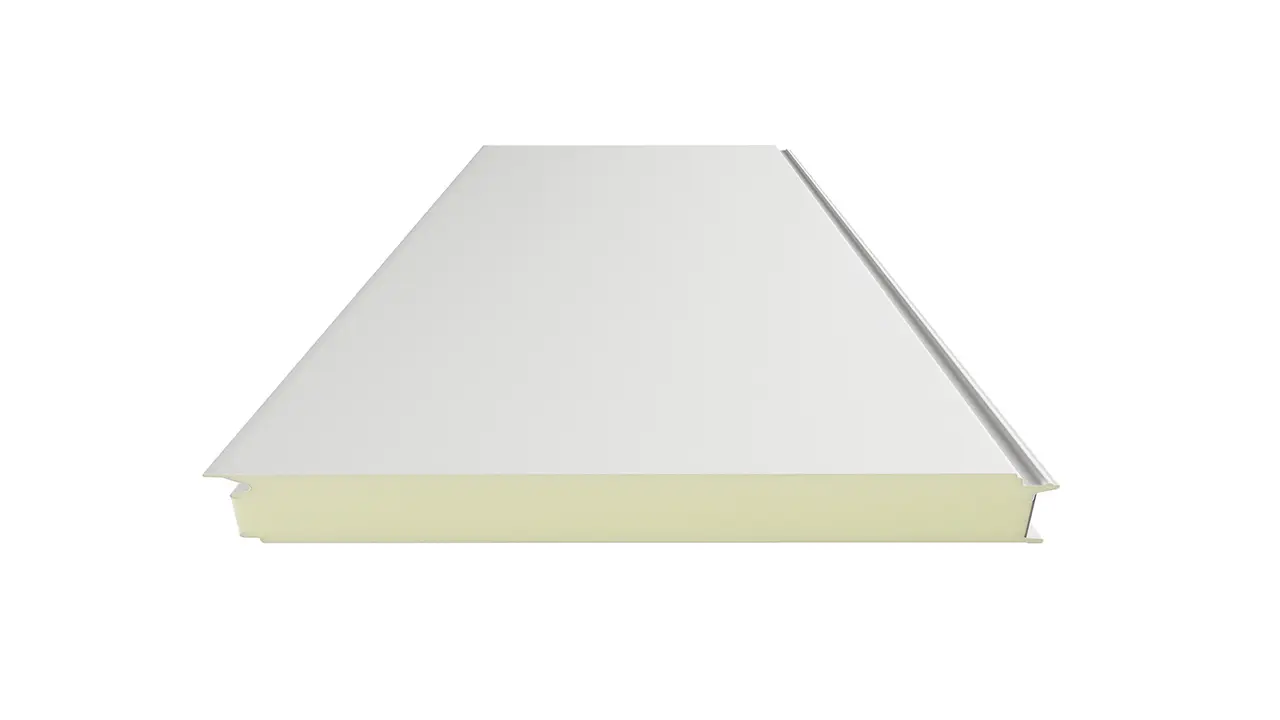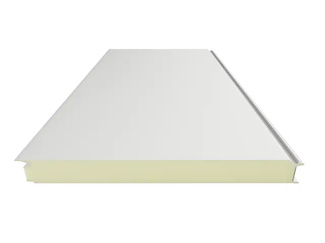A panel magja poliizocianurát (PIR) hab, amely a kiváló hőszigetelés mellett (λ ~0,024 W/m·K) fokozott tűzbiztonságot is nyújt (B-s2,d0 osztály – nem terjeszti a lángot).